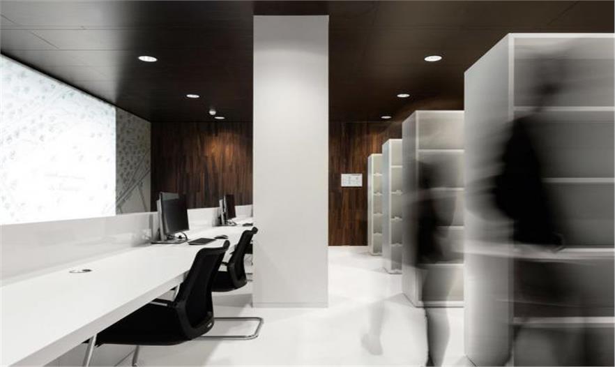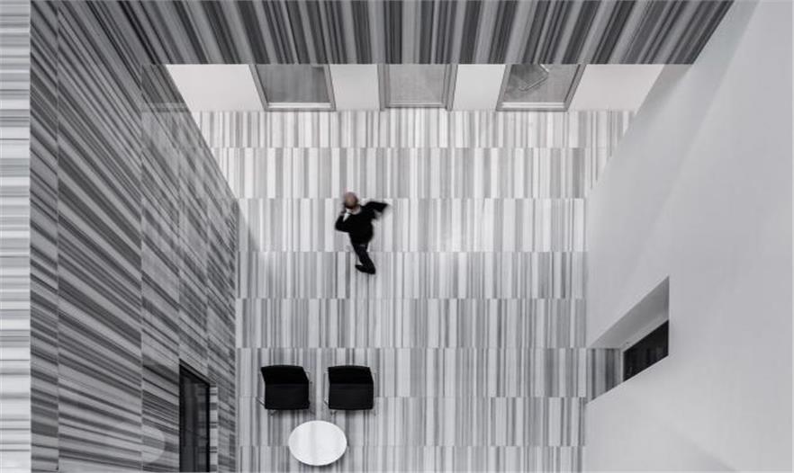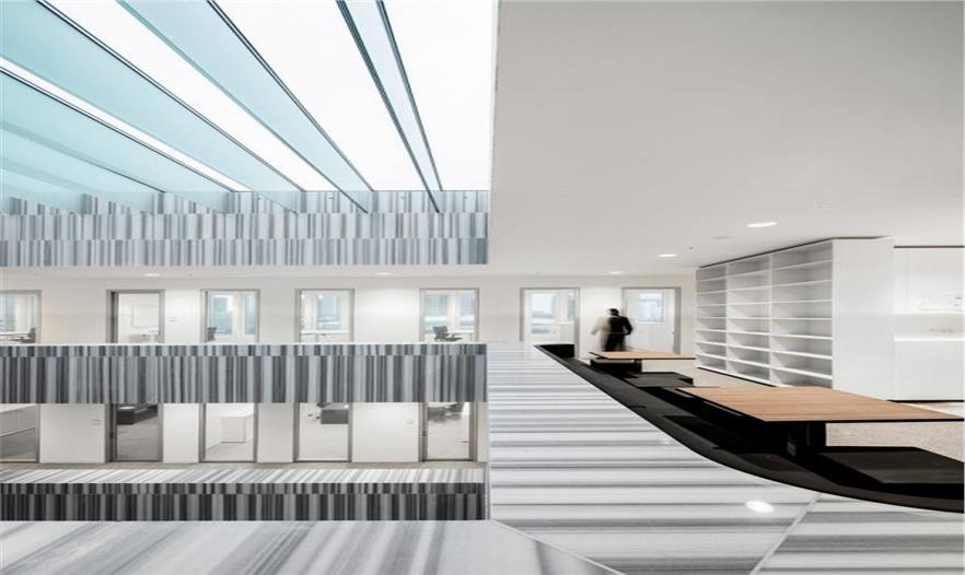 樓上各層區(qū)域則分配給了辦公空間、法院內(nèi)庭、理事會、一間餐廳以及一間帶閱覽室的圖書館。條紋狀的大理石材料覆蓋至墻壁、地板以及欄桿等各個區(qū)域,形成豐富的視覺層次。餐廳作為休閑餐飲空間則用了橡木地板,自然溫馨。