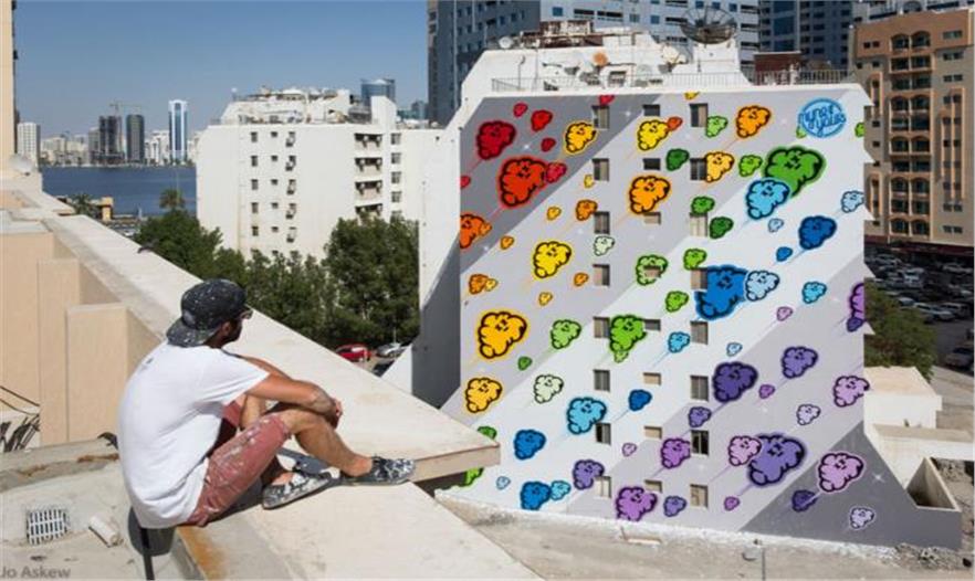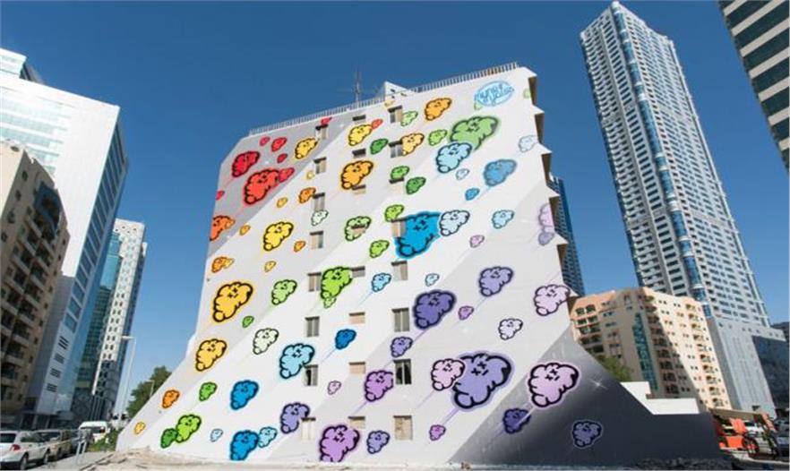 非營利機構(gòu)Maraya藝術(shù)中心與Myneandyours合作最近在阿拉伯聯(lián)合酋長國沙迦的一座建筑的一個立面完成了這個五彩的壁畫。