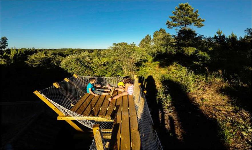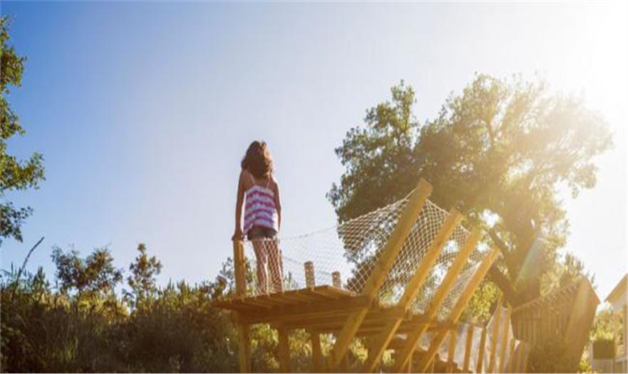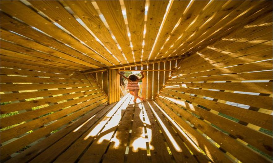 這個樹屋沿著墻壁建造,設(shè)有階梯、小屋、座位和陽臺。
