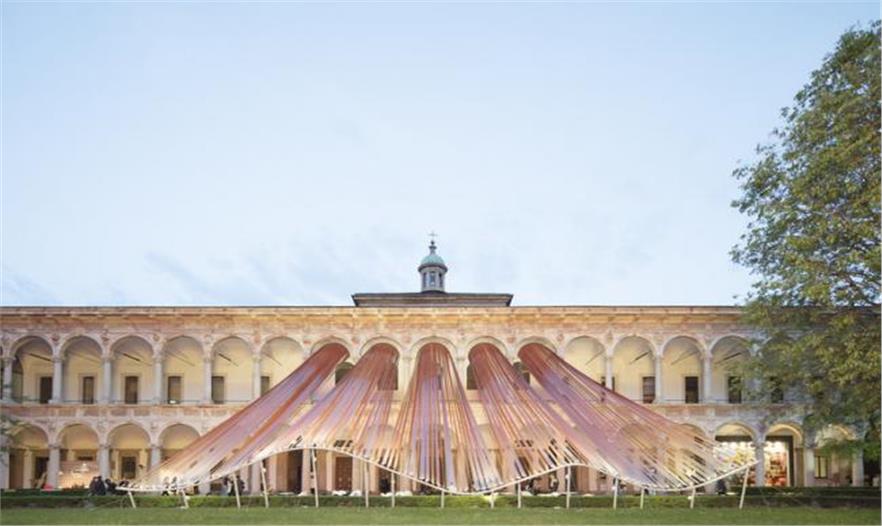 MAD的作品“無界”裝置為意大利雜志 Interni 而設(shè)計,是一片由ETFE條帶材質(zhì)構(gòu)成的頂棚,位于一塊意大利經(jīng)典的庭院中,具有漸變的色彩。建筑師表示:“該裝置變現(xiàn)了天空的色彩變化,柱子和涼廊隱約可見。晚上時它成為了一個發(fā)光的表面,為庭院增添了色彩。”