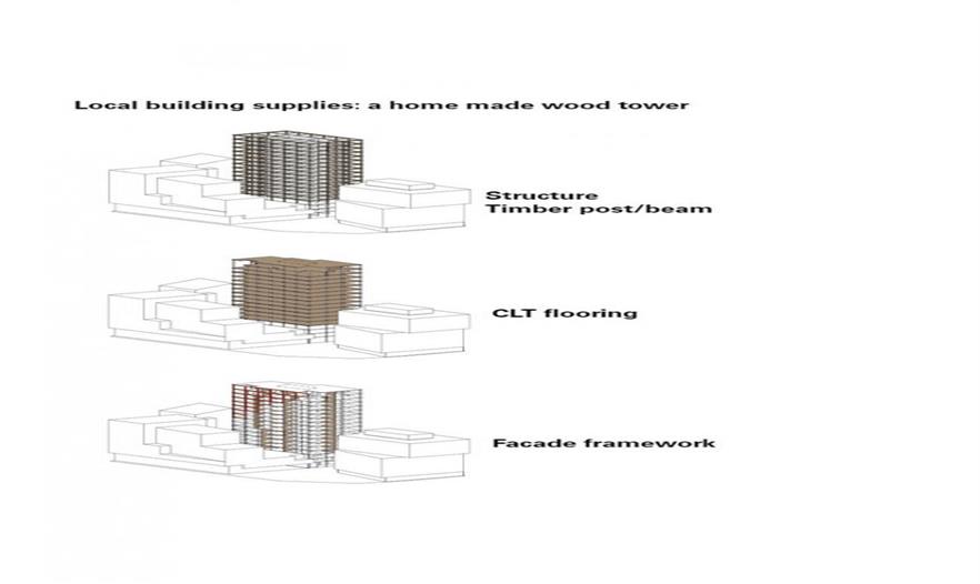 該項(xiàng)目的塔樓部分采用膠合板( LVL)和集成材作為桁架與梁的附屬結(jié)構(gòu), 并采用交錯(cuò)層壓木材(CLT)板材作為地板,建筑幕墻框架的主要組成中也采用了木材料。一層層的懸挑陽(yáng)臺(tái)遮擋了太陽(yáng)直射光,同時(shí)保留了充足視野。陽(yáng)臺(tái)的花園與綠色屋頂讓臨近的較低處空間獲得了更加柔和的自然光,而且對(duì)建筑所在的區(qū)域小氣候進(jìn)行了條件。玻璃與鋼的組成很好的解決了幕墻保溫隔熱問(wèn)題。