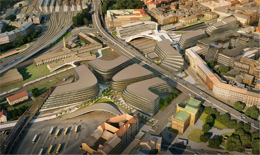 扎哈·哈迪德建筑事務(wù)所(Zaha Hadid Architects)(ZHA)最近公布了一項重建計劃,項目毗鄰布拉格的馬薩里克火車站,是一塊面積為22,000平方米的拆遷地塊。Penta 公司選擇了ZHA建筑事務(wù)所作為項目開發(fā)的合作伙伴。Penta公司是一家活躍在歐洲的一家投資公司,在2014年贏得了該地塊的開發(fā)資格,并計劃決定在此建立新的中央商務(wù)區(qū)。ZHA建筑事務(wù)所計劃整合現(xiàn)有的交通狀況,包括郊區(qū)和國內(nèi)鐵路服務(wù),巴士總站,城市地鐵B號線,以及一條與哈維爾國際機場連接的機場輕軌線路。這里距布拉格中心廣場大約為一公里的距離,整個設(shè)計力求在橫向的鐵路線和縱向的老城區(qū)公共區(qū)域之間建立一個平衡的狀態(tài)。