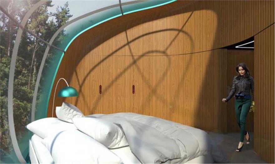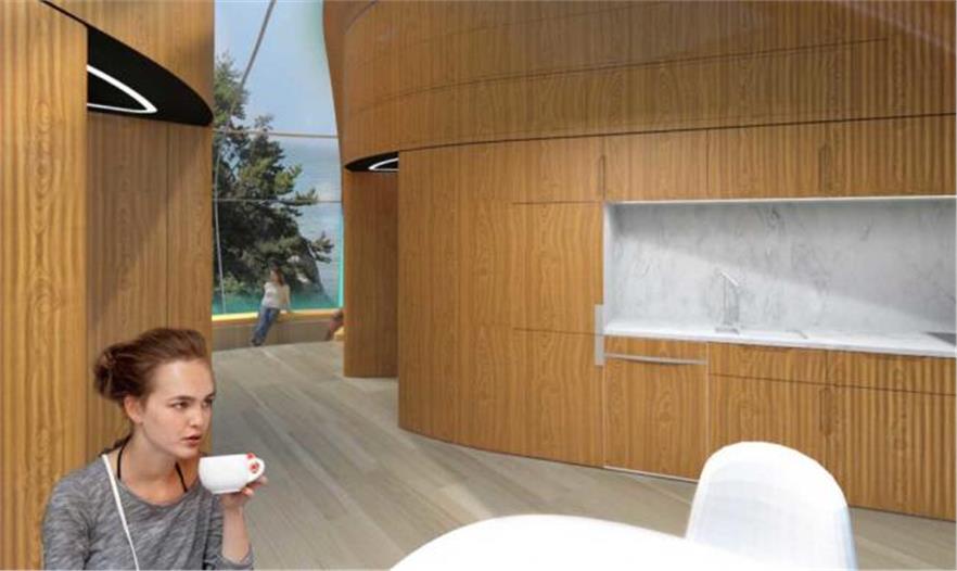 這個95平方米的橢圓形Nest Pod高架在空中,最小化區(qū)域影響,而人們通過一個可伸縮的階梯和艙門進入。其預(yù)制立面大部分是光滑的,最大化戶外的全景?;⌒蔚氖覂?nèi)空間沿著南北軸線分離開,最優(yōu)化自然通風(fēng)和社交互動。每個小屋包括兩個臥室、餐廳和起居室。這個預(yù)制房屋也可依據(jù)房主的需求特制,改變材料配置增加房屋數(shù)量。