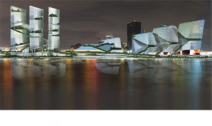 表演空間、露天劇院、濱水咖啡店和廊道的設(shè)計(jì)也會(huì)進(jìn)一步豐富濱水生活。生態(tài)城市的生物融合策略包括加入幾個(gè)可持續(xù)發(fā)展系統(tǒng),還有利用風(fēng)能和太陽(yáng)能的智能立面。該公共區(qū)域包括將棕色城市區(qū)域修復(fù)成綠色公園,通過(guò)蓄水池和可滲透表面進(jìn)行可持續(xù)性排水。該建筑形式也用于捕獲雨水,進(jìn)行水源再利用,灌溉空中花園和綠墻。
