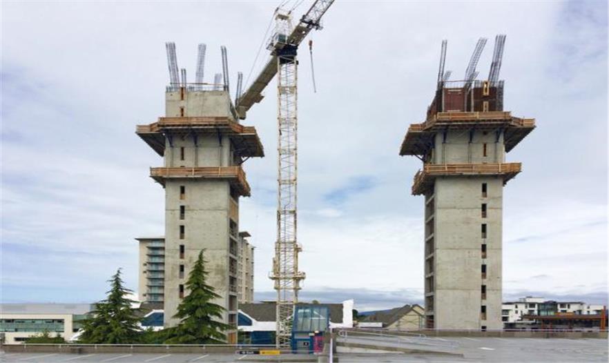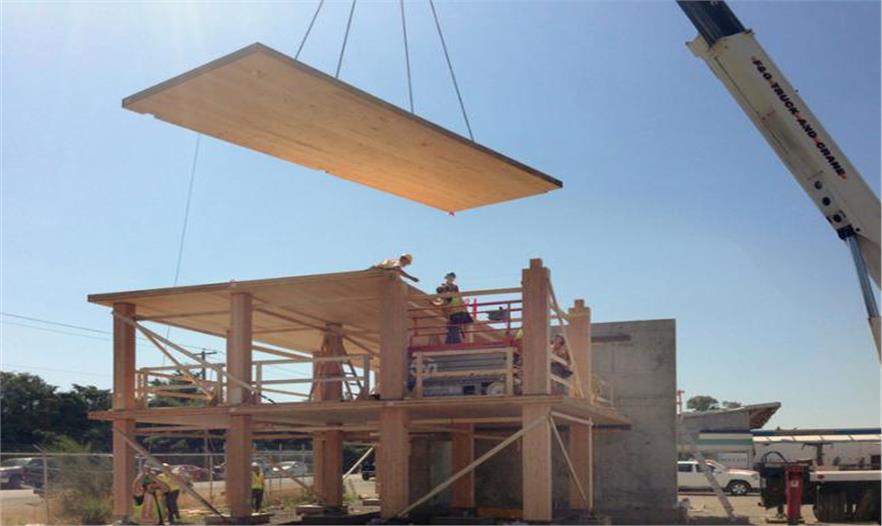 建筑在施工中建造了一個(gè)單層的臺(tái)面,目前正在施工的是兩個(gè)混凝土核心體,在這棟17層高建筑的屋頂采用了預(yù)制鋼梁結(jié)構(gòu)和金屬屋頂。核心體量能夠?yàn)榻ㄖ頇M向穩(wěn)定性,而垂直方向的載荷由木結(jié)構(gòu)承載。建筑的膠合板結(jié)構(gòu)采用了鋼構(gòu)件連接,為縱向和橫向網(wǎng)格結(jié)構(gòu)十字層面板之間提供了載荷的傳遞,使得新建筑滿足了加拿大2015年國家建筑規(guī)范中的抗震設(shè)計(jì)要求。