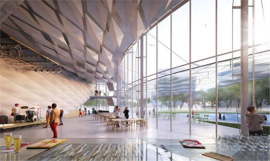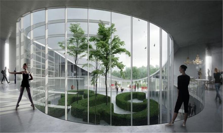 項目位于城市的西邊,靠近薩格勒布廣場,設(shè)計師通過四個獨立形狀的木制和玻璃外墻以及波狀形的外形來與周圍環(huán)境相呼應(yīng)。此外,它的屋頂被稱為“第五立面”,展示出了兩種形式的正方體和球面相交而形成一個中央圓形花園。