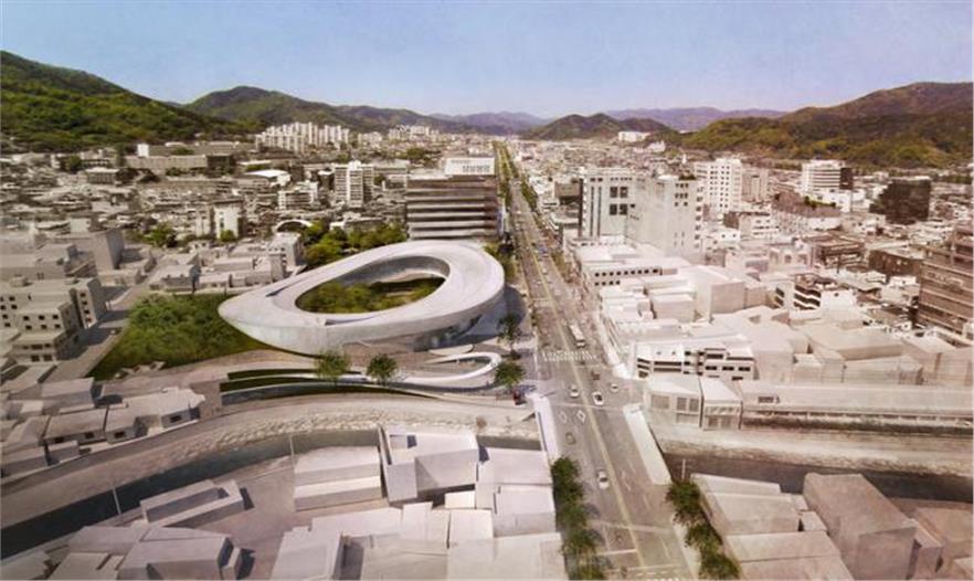 Matteo Cainer Architects為韓國(guó) South Korea 的一座新藝術(shù)、交流和文化中心——順天藝術(shù)平臺(tái)揭幕了他們的方案。方案受到了該市的歷史符號(hào)邊界城墻啟發(fā),在一個(gè)環(huán)形的擠出體量中間隱藏著“客廳”。抬升的剖面提供了一個(gè)"開放的大門"。該提案是順天藝術(shù)平臺(tái)競(jìng)賽的作品(該競(jìng)賽最終由 Studio MADe 中標(biāo)),對(duì)于競(jìng)賽的住址給予了一種有力的響應(yīng)。