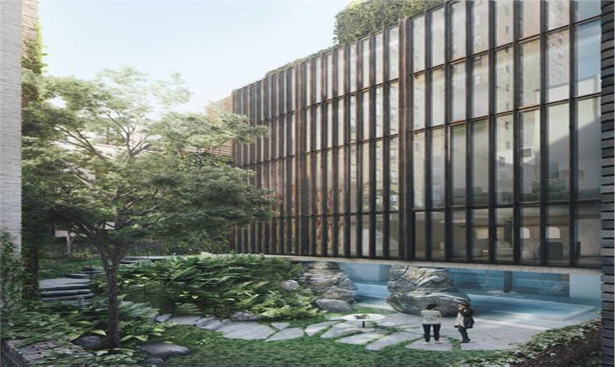 另外,項(xiàng)目后方將形成一面開放玻璃與青銅立面,在最底層用大石塊重組成了中央公園的巨石。