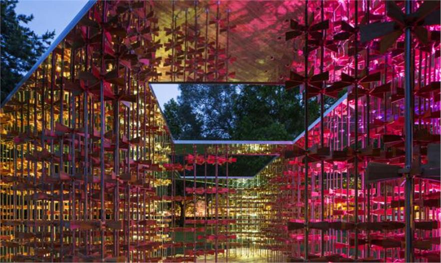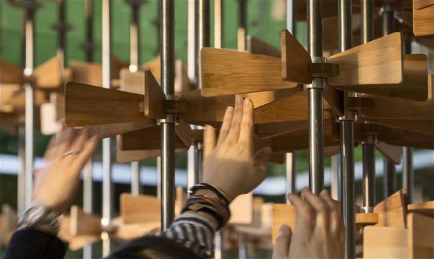 該展館是由不銹鋼棒構成的森林,這種堆疊起來的樣式讓人聯(lián)想到兒童紙風車。通過凸輪運動,一個獨立的部分將會和鄰近的輪子一起運動,創(chuàng)建出了一個森林中的漣漪效應。這也可以比喻為“社區(qū)集體的力量”,是由一個行動引發(fā)的連鎖反應。它也創(chuàng)造了一個運動中的物體所擁有的充沛精力。