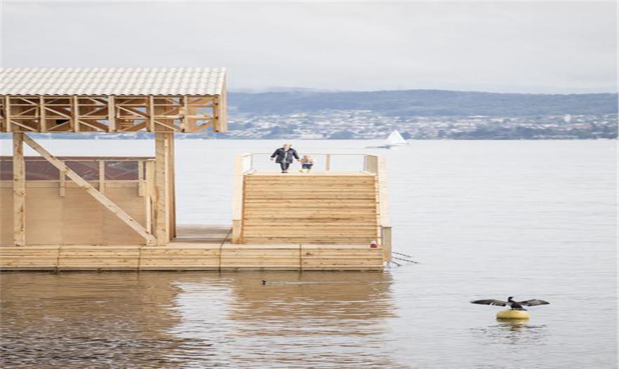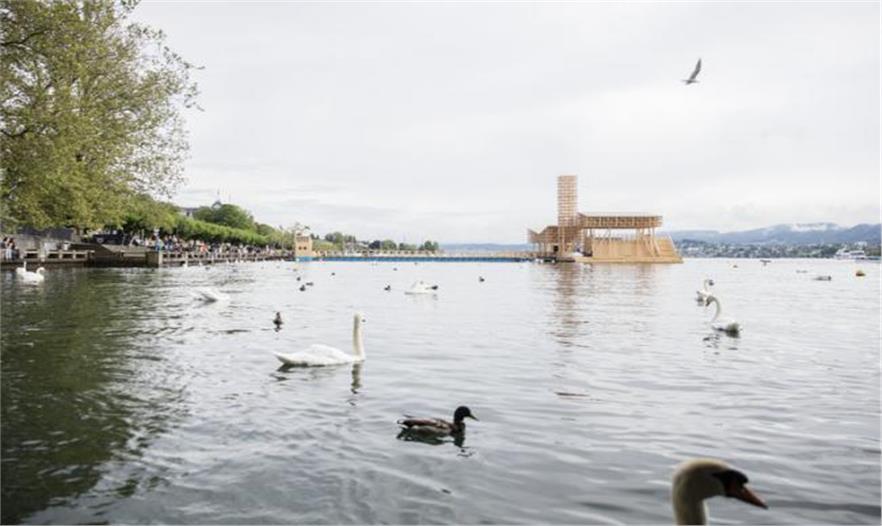 6月11日,歐洲當(dāng)代藝術(shù)雙年展(Manifesta),正式的開(kāi)始了在主辦城市瑞士蘇黎世為期100天的展出。而在這個(gè)展會(huì)的中心位置,蘇黎世湖面上是一件由木頭制作的漂浮建筑作品,叫做反射亭。這件臨時(shí)建筑是由Studio Tom Emerson 工作室設(shè)計(jì)并建造的,該建筑的主要結(jié)構(gòu)為木材,本屆雙年展的館長(zhǎng) Christian Jankowski 將其描述為是一個(gè)”帶有巨大LED顯示屏的多功能的浮動(dòng)平臺(tái),它是一個(gè)舞臺(tái),一個(gè)游泳池和一個(gè)酒吧。”