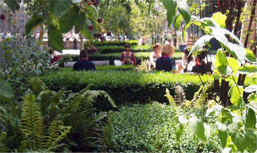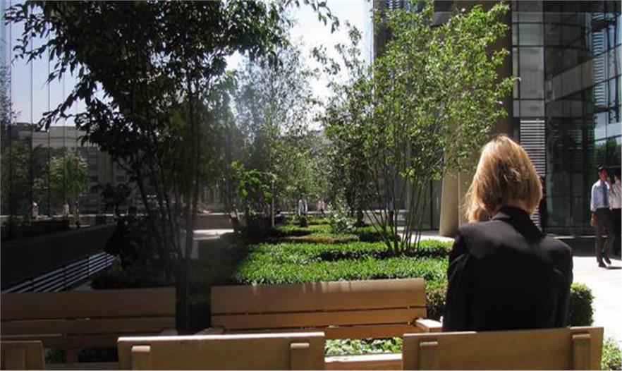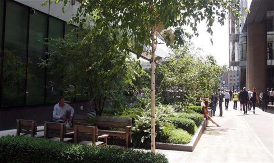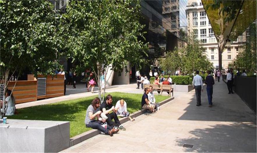 Townshend Landscape Architects事務(wù)所建造了這個線性開放空間,供行人駐足、休息以及欣賞河景。傾斜的花崗巖長凳會讓人們直接看到泰晤士河,而草坪區(qū)位于該道路的朝陽的南端,成為夏季人們坐下休息的非正式區(qū)域。多莖的唐棣樹提供陰涼,同時多年生草本植物也讓該空間全年多彩繽紛。工人和游客可以在木制和花崗巖長凳休息,愜意一番。