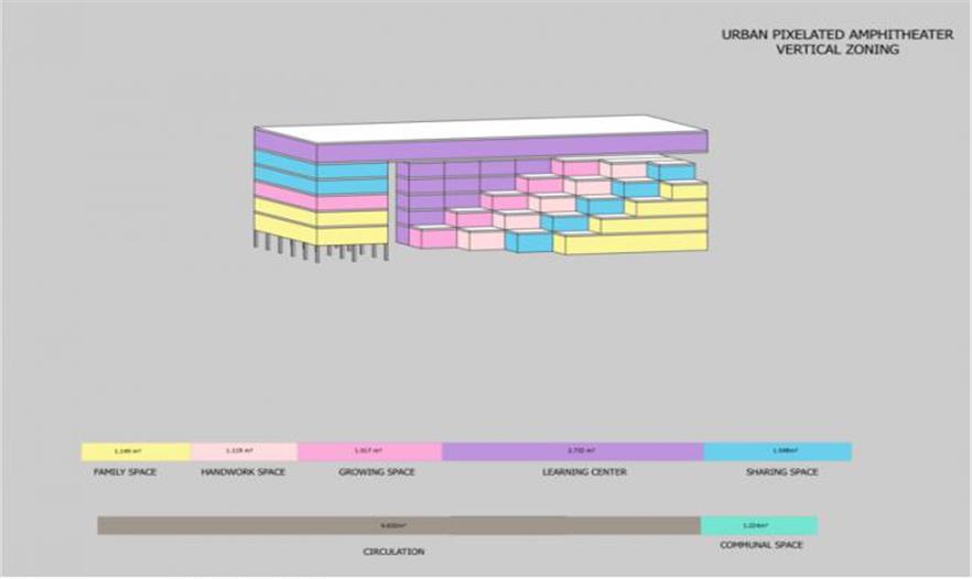 像素化的基座上包含了建筑的主要功能設(shè)施,其中有一個禮堂,家庭空間,一個青少年中心,美食廣場,產(chǎn)品實驗室和一些店鋪。這部分體量就是一個“城市客廳” ,這是由其自身的不同部分組成,其中的五個柱子也增加了空間的大小,每一個都包含了一個不同的功能”并且被放置在相關(guān)的活動空間之間,這是為了獲取最大化的使用效率”讓用戶體驗。因此當(dāng)人們沿一個柱子的方向行走時,游客會遇到類似的功能,但如果上下移動時,他們也會有一個橫向功能的體驗。