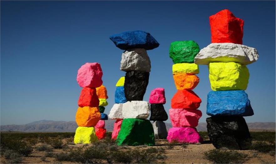 瑞士藝術(shù)家烏戈•羅迪納(Ugo Rondinone)平常會注意石林,在美國西南部經(jīng)常會發(fā)現(xiàn)高聳、突出的巖石,這也是他最新藝術(shù)裝置——7大巨型山的設(shè)計(jì)靈感。由于其團(tuán)隊(duì)的幫助,如工程師和建筑工人,他在內(nèi)華達(dá)沙漠中發(fā)現(xiàn)了33塊巖石(一些重達(dá)25401千克),然后就將它們堆疊成7個(gè)高聳的石林,噴漆上耀眼的顏色,如明亮的粉色和熒光黃。即使夜幕來臨,拉斯維加斯南部州際公路15上的司機(jī)也能看到這個(gè)霓虹裝置,一直持續(xù)到2018年。羅迪納表示“其目的是為這個(gè)公共空間帶來詩意,晚上也會出現(xiàn)彩虹。”