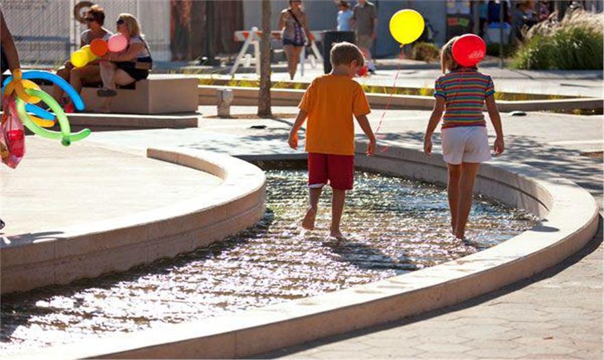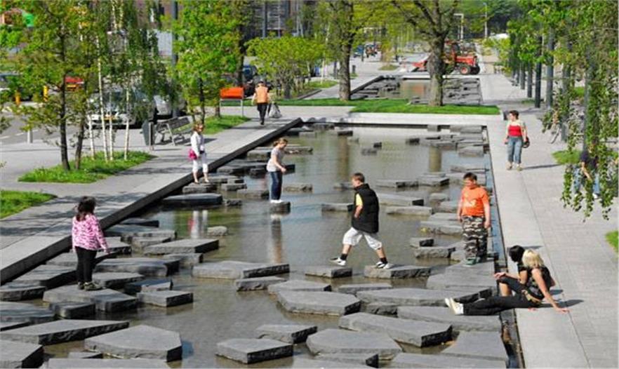 該街道附近是一條高質(zhì)量的步行道,孩子、成年人和老年人可在這欣賞水景。這條小溪沿線有許多密集的長(zhǎng)凳,朝向街道和步行空間,還種植樹木提供陰涼。孩子們喜歡跳到踏腳石上玩耍,因?yàn)樗洳⒉簧?,父母不用?dān)心孩子們跑來(lái)跑去的。這個(gè)項(xiàng)目適合所有年齡段的人。