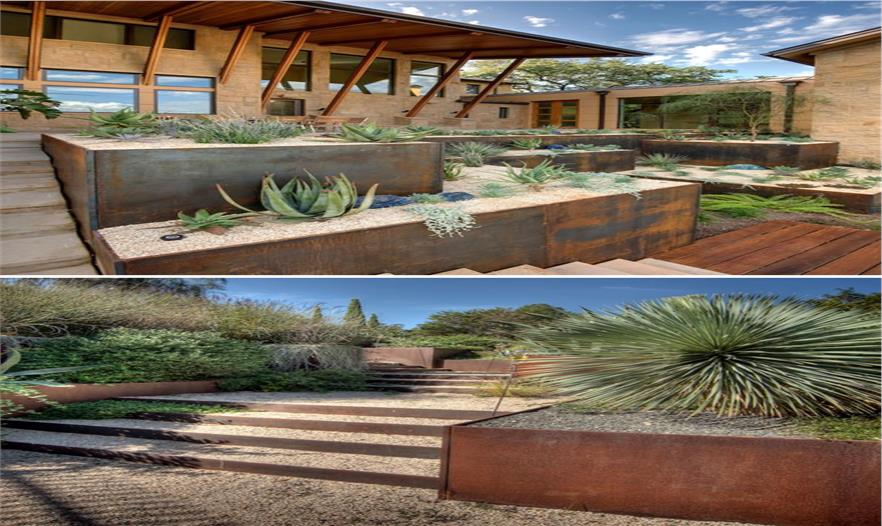 1.在耐候鋼花盆中種植多肉植物和其他荒漠植物,可以設計出低維護的花園,整年的景象都不錯。