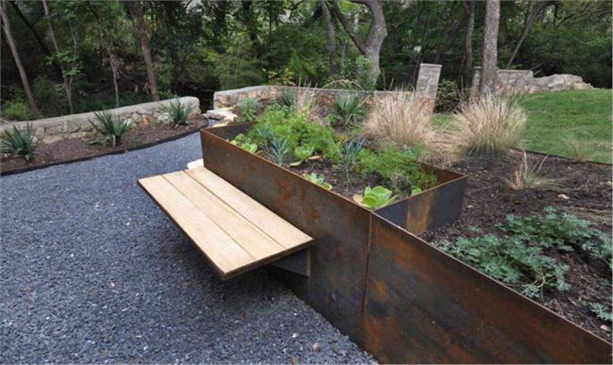 8.這個花盆是由木頭和耐候鋼綜合設計而成的,讓人們能夠坐下欣賞花園。