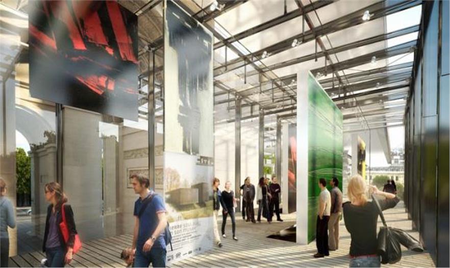 紀(jì)念碑的另一半將會(huì)保持原狀,在大鏡面的映射下形成一個(gè)完全的對(duì)稱結(jié)構(gòu)。在鏡面墻的另一面,是一面電子顯示頻幕,用來(lái)播放各種巴黎新聞事件。