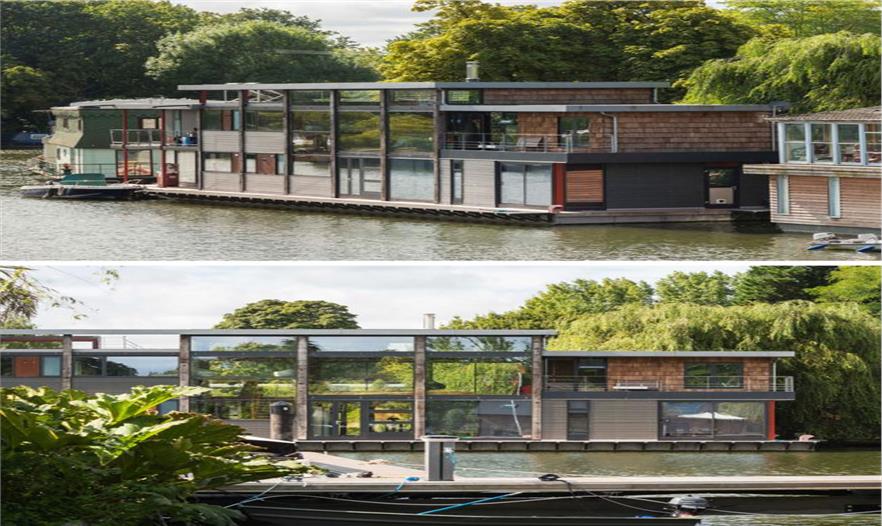 3.這個船屋漂浮在泰晤士河上,后面的陸地上有花園和車庫。