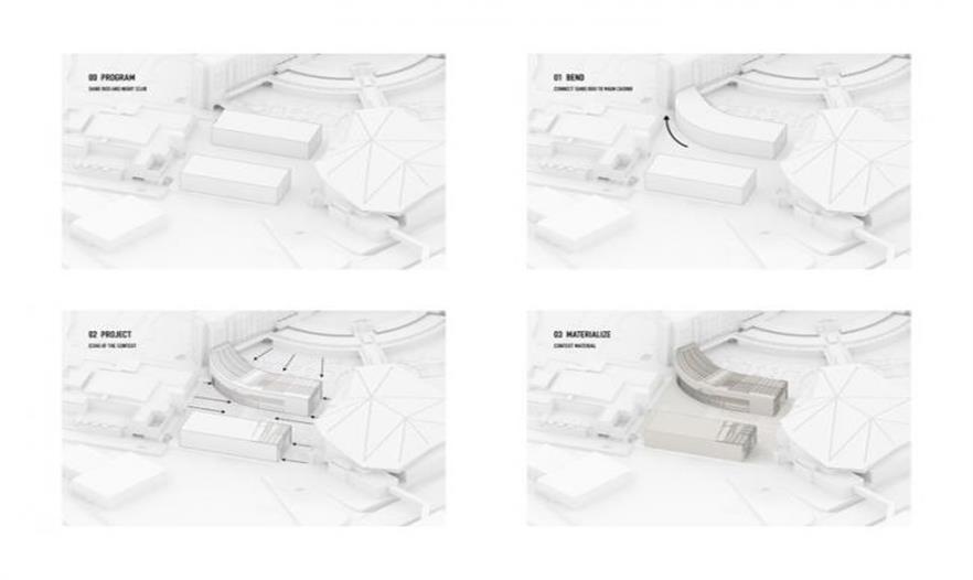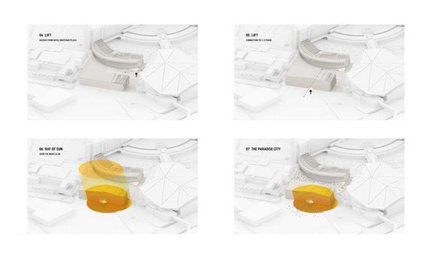 建筑有3600平米的零售空間,與旁邊一座賭場銜接。6200平米的夜店同時還有一個水俱樂部和屋頂花園,其中有玻璃地板等通透元素,創(chuàng)造了娛樂建筑的氛圍。兩座建筑之間有抬起的城市平臺,表面上有服務(wù)空間和停車場。