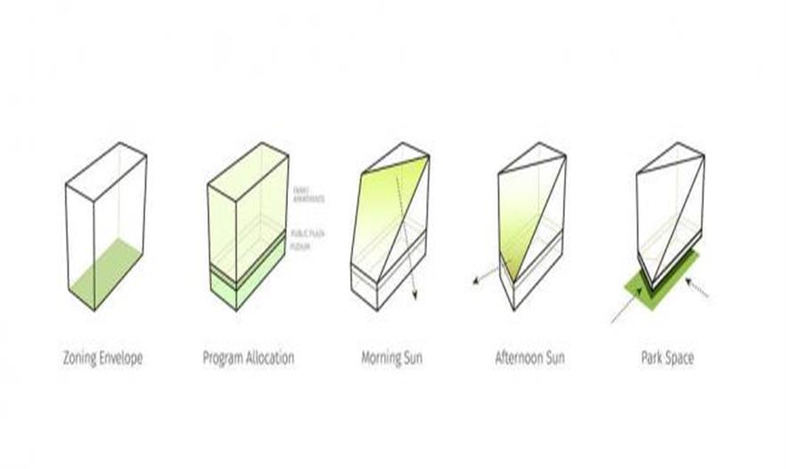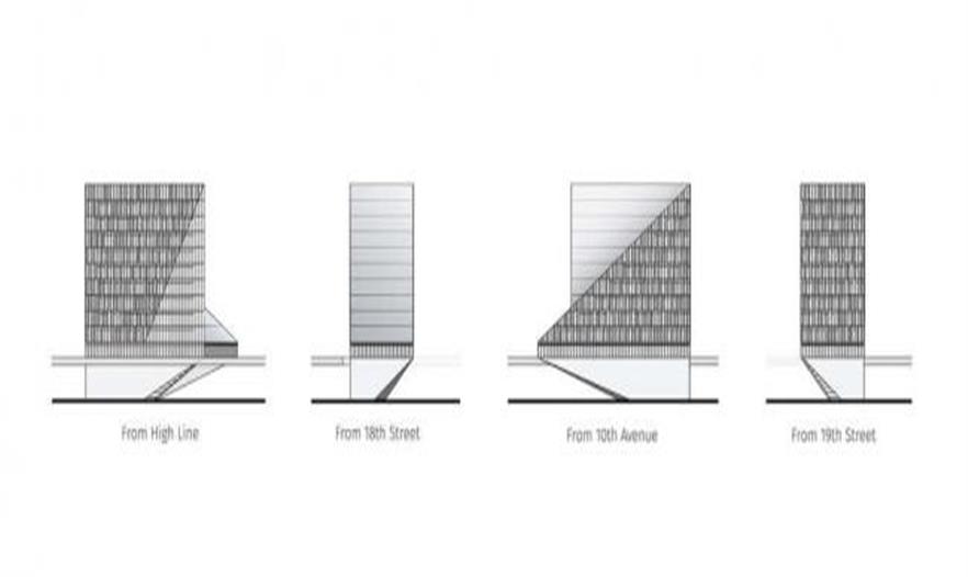 該塔樓的形狀依據(jù)太陽(yáng)光設(shè)計(jì),類似于珍妮•甘(Jeanne Gang)的太陽(yáng)能切片大廈。Weston Baker Creative事務(wù)所表示:“隨著太陽(yáng)從東到西橫跨天空時(shí),該建筑扭轉(zhuǎn)的形狀會(huì)平均分配日光。”在南部高樓,封閉式的中庭會(huì)設(shè)有10個(gè)梯田,供高線公園的游客觀賞,也供大樓居民觀看。頂層會(huì)有一個(gè)公共觀察園,第二層會(huì)有一個(gè)畫廊,都能從高線公園直接進(jìn)入里面。