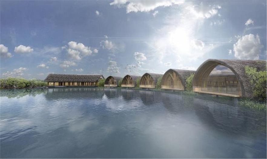 該項(xiàng)目計(jì)劃分為三個不同的領(lǐng)域進(jìn)行布局:主建筑,療養(yǎng)室和后屋,它們通過浮橋與主建筑相連。一面石墻指引著游客來到入口處,這為游客在進(jìn)入SPA放松前提供了一種瞬間封閉的感覺。該建筑由竹子建成,懸浮在水面上,陸地上是巨大的紅樹林和整個動植物生態(tài)群。