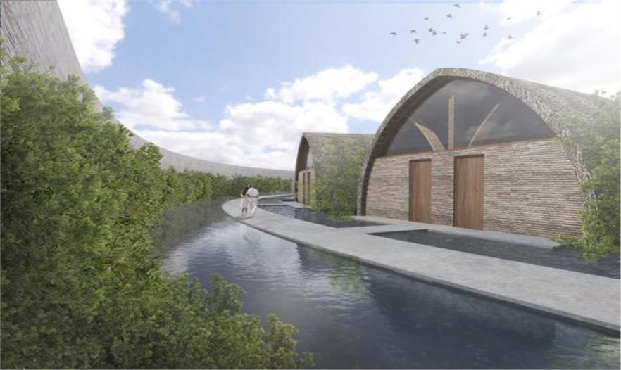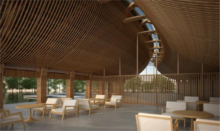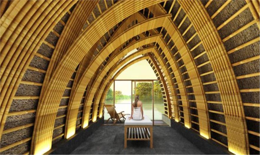 沿水庫弧線打造了十二個用竹子建造的主體建筑,里面有接待空間,等候區(qū)和腳部護(hù)理以及足療的咨詢室。彎曲的竹框架是從內(nèi)部開始彎曲,朝向天空,并在上面開有天窗,陽光從此照射進(jìn)來。專門的和露天空間由帶竹百葉的玻璃窗面板分開,室內(nèi)與室外之間的界限模糊。