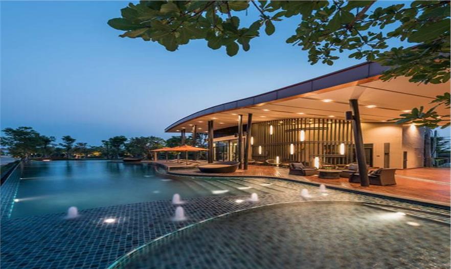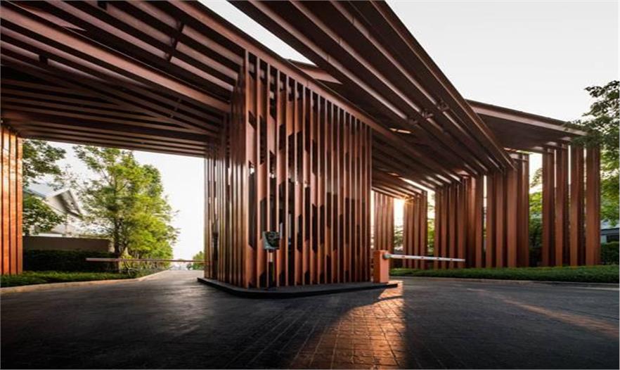 這個住宅項目的第一張圖就是入口設(shè)計:獨特的鄉(xiāng)村標(biāo)志應(yīng)用到大門設(shè)計中,帶有無數(shù)個重疊的框架,就像鋼鐵編織一樣。這會為游客留下強烈的第一印象。的確,這個設(shè)計是受泰國一個獨特地雕塑啟發(fā)而成,通過常綠灌木、照明設(shè)計和搶眼的顏色融合而成。