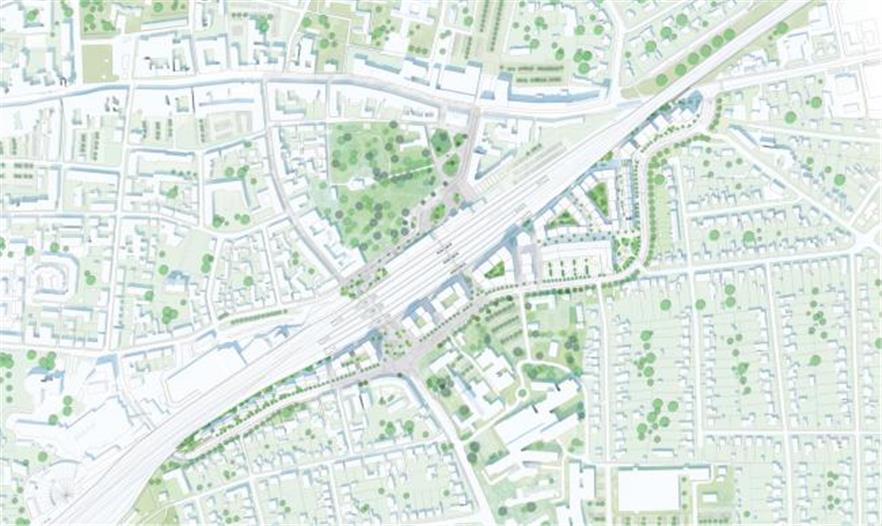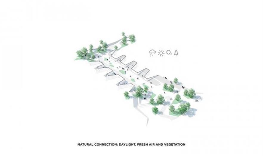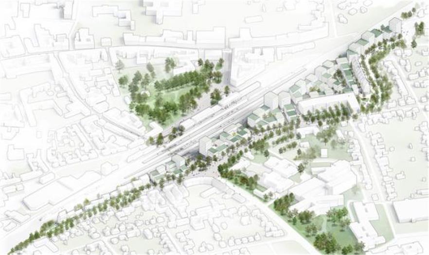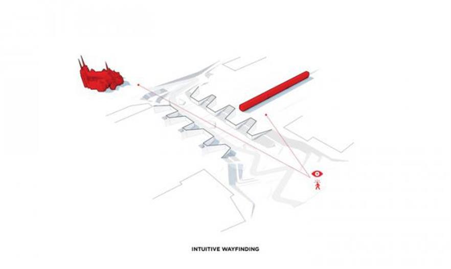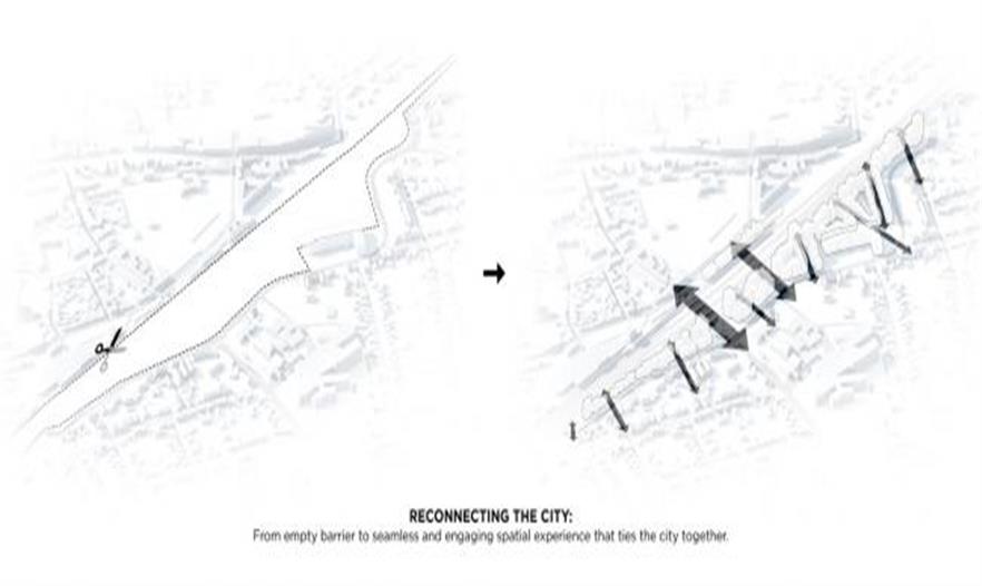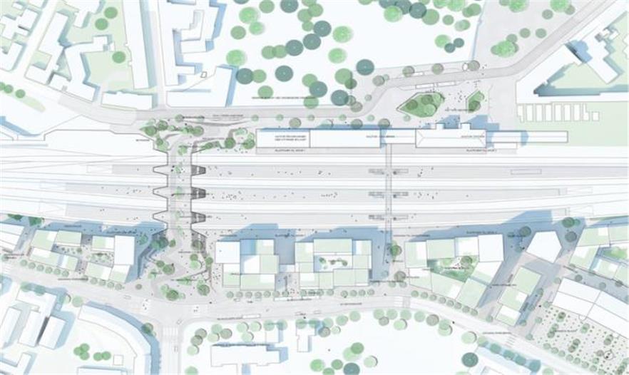 不使用傳統(tǒng)的橋梁或隧道,城市的兩邊將會(huì)通過(guò)軌道下面“開放的綠色城市空間”來(lái)連接,沿途林立商店,咖啡廳,服務(wù)區(qū)和非正式會(huì)議場(chǎng)所。組織分區(qū)塊提高效率,并通過(guò)車站直接觀察,為每天將近3萬(wàn)人次提供導(dǎo)航。