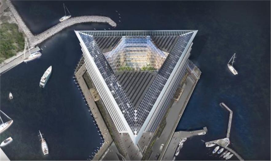 建筑的六層樓、屋頂天幕、和懸臂逐層向外延伸,在每個(gè)樓層面上創(chuàng)造出可自我遮陰的空間。這個(gè)三角形的建筑是根據(jù)周?chē)蚝退幍氐男螤疃ā?/p>