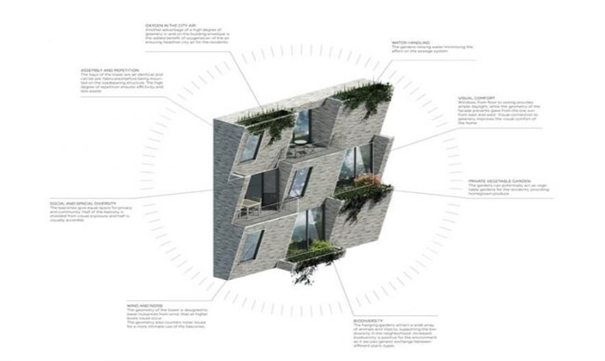項目所在場地曾是一個蔬菜市場,方案旨在通過鼓勵居民在高層花園中種植自己的作物,來恢復(fù)場地本土的根基。此外,建筑的一層可容納一個農(nóng)貿(mào)市場,居民可以在此進(jìn)行農(nóng)產(chǎn)品交易。