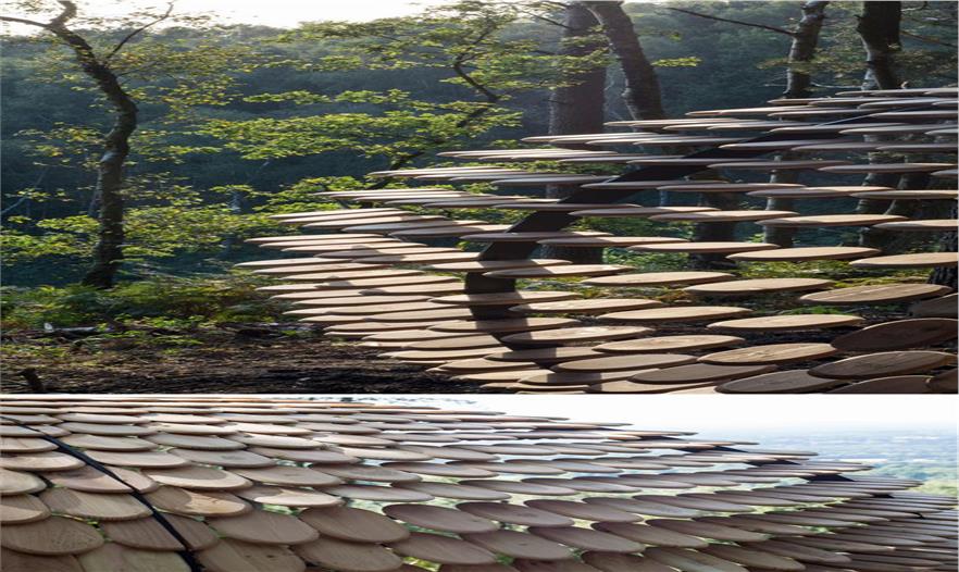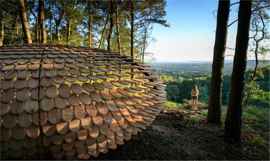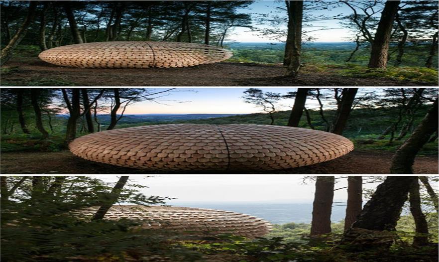 倫敦設(shè)計(jì)事務(wù)所Giles Miller聚焦創(chuàng)意表面、材料和雕塑作品,最新的設(shè)計(jì)名為“Perspectives”。“Perspectives”是他們第一個(gè)固定的建筑雕塑裝置,是用雪松木瓦覆蓋而成的有機(jī)涼亭。