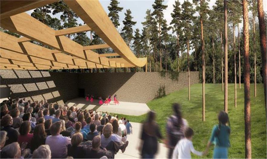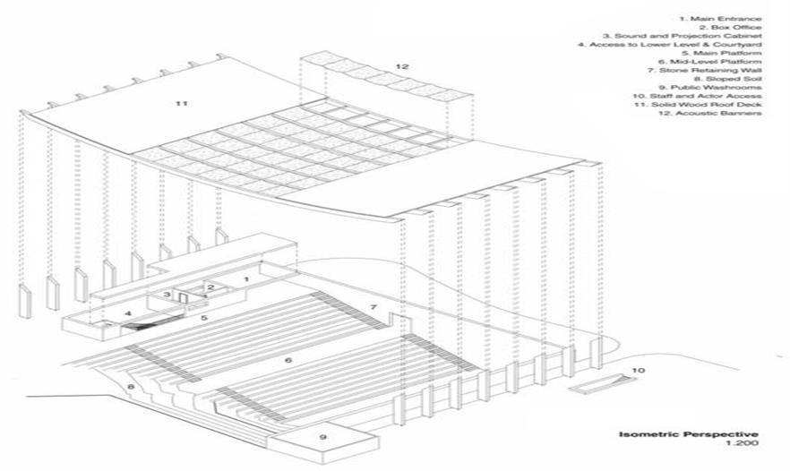 該方案充分的利用了場地的自然坡度,增加了觀眾席位,這些座位從劇院一直延伸到外面的草地坡上,并且是由混凝土結構和草地植被相結合構成,將建筑與景觀融合在了一起。