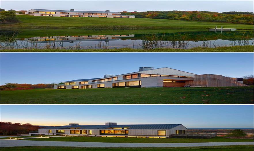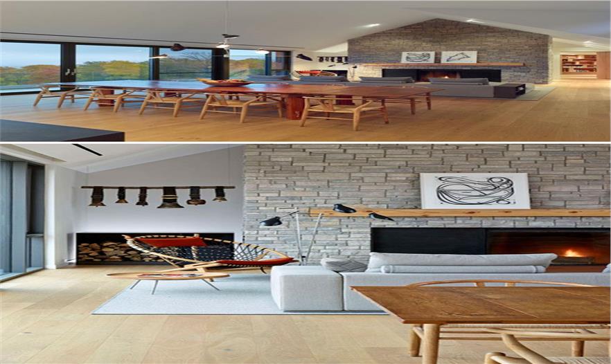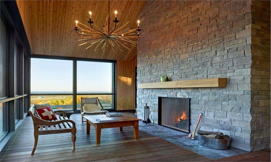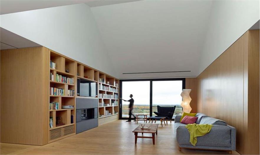 第二層是擺滿書籍的書柜,圍繞電視以及另一個(gè)壁爐設(shè)計(jì)。另一個(gè)壁爐位于休閑的客廳里,周圍環(huán)繞著窗戶以及木制地板和天花板。