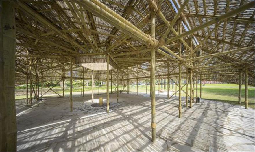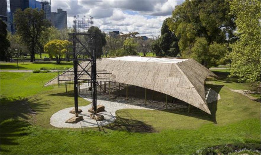 MPavilion 2016是手工建筑的典范,采用印度手工技術和材料建造。7千米的竹子、50噸的石頭和26千米的繩索都是從印度和澳大利亞運來,用于建造這個16.8平方米的夏季展廳。屋頂使用的枝條是印度的手工藝者歷時4個月編織Karvi植物而成。