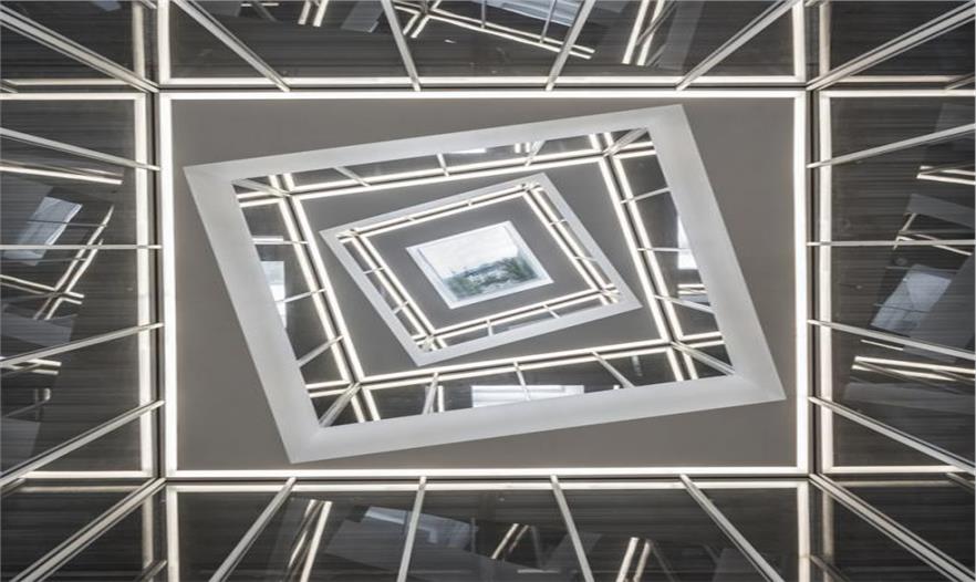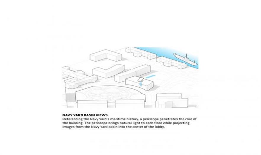 參照海軍基地的歷史,在滿足充足的自然光照的同時(shí),貫穿上下的電梯中庭成為了一個(gè)大型潛望鏡,頂部的鏡面將遠(yuǎn)處港口中??客艘鄞坏漠嬅嬲凵淙胧覂?nèi)。 游客和員工可以坐在毗鄰碼頭欣賞的來往的船只,同時(shí)享受著將建筑及其居民連接到周圍環(huán)境的中央綠色公園美景。