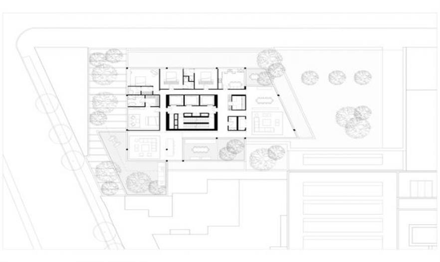 這棟24層的大樓在底層設(shè)有一個(gè)長(zhǎng)廊形狀的商業(yè)空間,它架在基座之上,這樣就將下面的幾層縮小,形成了一個(gè)雕塑花園,大樓的上層為住宅單元。