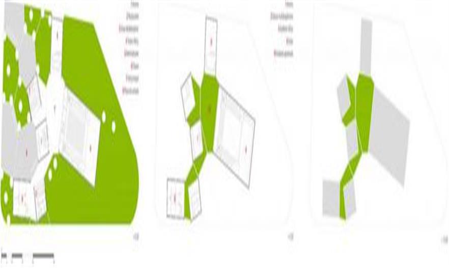 項目為一座藝術(shù)中心,其中的功能各行其是,但是整體上取得平衡且相互加強。和上文所舉的例子一樣,每個單元對外都是獨立的,并在內(nèi)部有所聯(lián)系,但是單元之間互不干涉。設(shè)計的概念就是在這個基本的前提下形成的。市政廳要求的各個功能都被設(shè)計成了單元體塊,沿地塊邊緣排布,創(chuàng)造了一個沒有等級、和平共處的空間,體現(xiàn)了小社區(qū)理念。在藝術(shù)中心里,每個單元都可以作為單獨的“房子”供人舉辦不同活動,而這些單元聚集在一起,就成為了一個充滿活力的“城鎮(zhèn)”。游客可以通過三條主路交匯處寬闊的入口廣場進入項目,這些道路一直延伸到建筑之中,加強了“城鎮(zhèn)”的感覺。在體塊靠近邊緣的地方會形成公共空間,同時作為不同單元的室外入口使用。