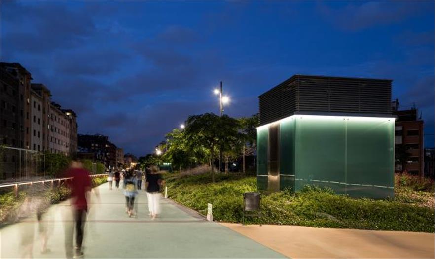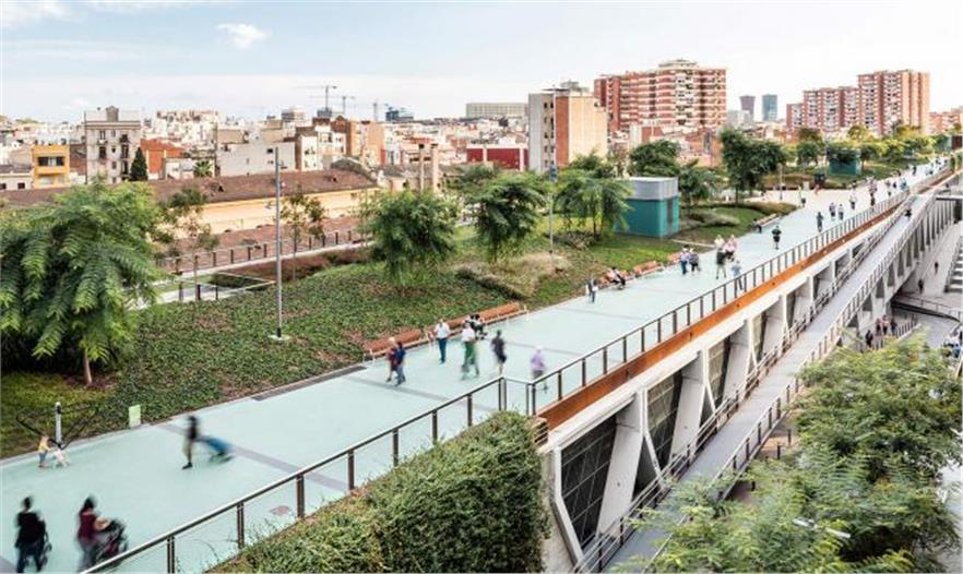 該規(guī)劃稱為“Jardins de la Rambla de Sants”,包括環(huán)繞6條鐵路線的廊道,由于轉(zhuǎn)移到地下花費太大,在該城市主火車站附近的擁堵區(qū)域建造一個植被繁茂的城市空間。這個800米長的廊道是以沃倫梁形式的預(yù)制混凝土箱構(gòu)成,喚起對傳統(tǒng)鐵路橋的回憶。三角形箱裝滿玻璃,隔離噪音,同時還能看到地面行駛而過的火車。