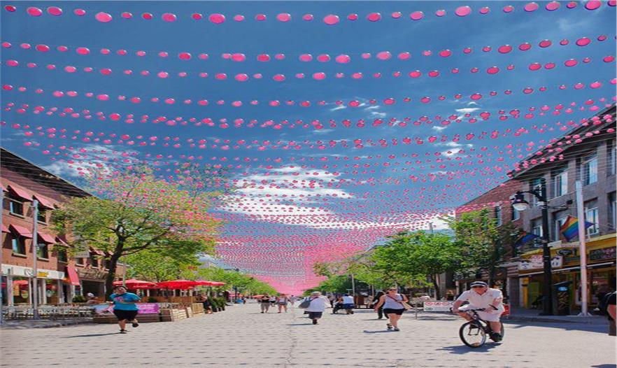 自2011年起的每個(gè)夏天,蒙特利爾同志村圣凱瑟琳街東1千米長的街道被改造成一個(gè)行人友好型商場??笨俗钪木坝^設(shè)計(jì)師克勞德•科米爾(Claude Cormier)建造了其全球聞名的藝術(shù)裝置,名為“Pink Balls”。這個(gè)五彩的藝術(shù)裝置是由17萬個(gè)粉紅色的球構(gòu)成,懸掛在街道沿線的樹木上,這個(gè)現(xiàn)代化景觀設(shè)計(jì)使該街區(qū)更加富有魔力。