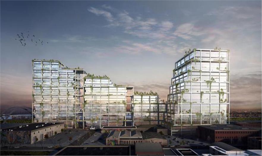 BIG的方案也囊括在這個網(wǎng)格混凝土結(jié)構(gòu)內(nèi),從3個方向設(shè)計。這個建筑的每個突出部分邊長13米(45英尺),包含規(guī)劃元素,計劃由最后的房客定制住宅或辦公空間。該建筑會讓住戶發(fā)表空間配置計劃,不管是室內(nèi)部分還是增建部分。規(guī)劃中的某些突出部分是開放的,成為公共走廊,目的在于將一樓零售區(qū)域與提議的環(huán)河步道、洛杉磯河和周圍的社區(qū)連接起來。當(dāng)這些走廊在項目中出現(xiàn)時,每次都會切斷整個突出部分,建造出3個獨立的建筑,再由混凝土鋼筋連接起來。最后的模塊或出或進,依賴于塔樓設(shè)計,構(gòu)成金字塔狀的形式。