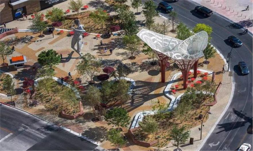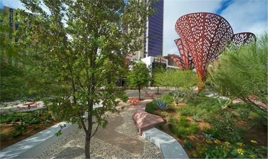 拉斯維加斯沿線的私營企業(yè)主意識到對戶外公共空間的投資獲得了回報, “The Park”——拉斯維加斯大道沿線的第一個公園就是證明。沒有壓力,但設(shè)計了一系列標(biāo)志性的遮陰元素、水景、沙漠植被(耐旱樹木)和雕塑(捕獲了所有旅游地的精華),減緩該區(qū)域的幾個區(qū)域問題,從高溫到干旱和塵暴。“The Park”與人工旅游勝地形成對比,意味著將拉斯維加斯塑造成綠洲的潛力。