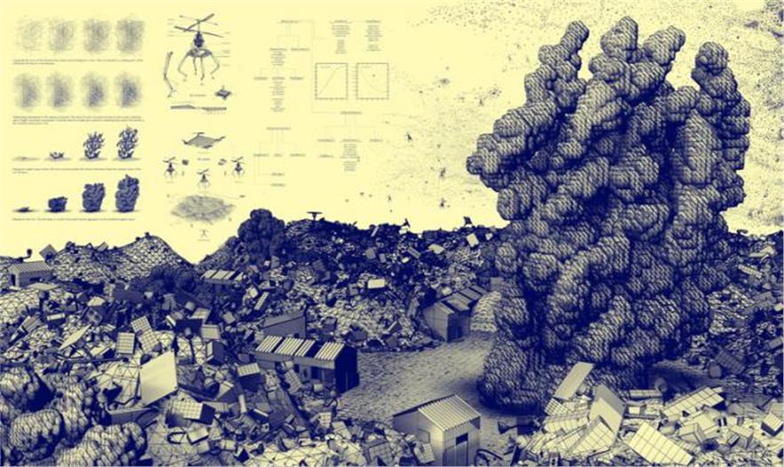自復制自動機是發(fā)生于關于偶極子——主體與客體,自然與人工,意向性和隨機性,設計與非設計之間的交流與排斥的理論調(diào)研之后的一種設計過程。所選擇的設計工具是沒有維度的點。設計從構思對象轉(zhuǎn)變?yōu)閷嶓w化對象的過程。最終選取的主要原則是生命現(xiàn)象的凝結(jié)(運動,新陳代謝,繁殖)。