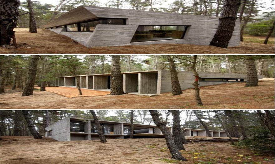 6. 這個混凝土住宅與其周圍的森林形成了鮮明的對比。