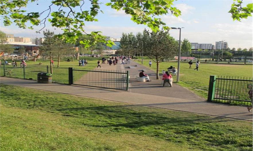 前往附近喬巴姆學(xué)院(位于之前的奧運(yùn)村中)的道路斜對(duì)角地切斷了這塊綠色草地,從東北的雷敦公路一直延伸到西南的Temple Mill路。所以社區(qū)的學(xué)生白天就能步行,感受不一樣的景觀,還很安全。