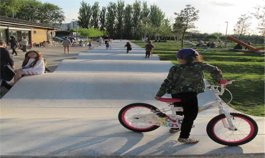 這條路是褐土色和黑色兩色,將自行車道與人行道分離開:第一條道路有不同高度的障礙物和坡度,增添體驗(yàn)樂(lè)趣,挑戰(zhàn)使用者的技術(shù),同時(shí)學(xué)習(xí)騎行。