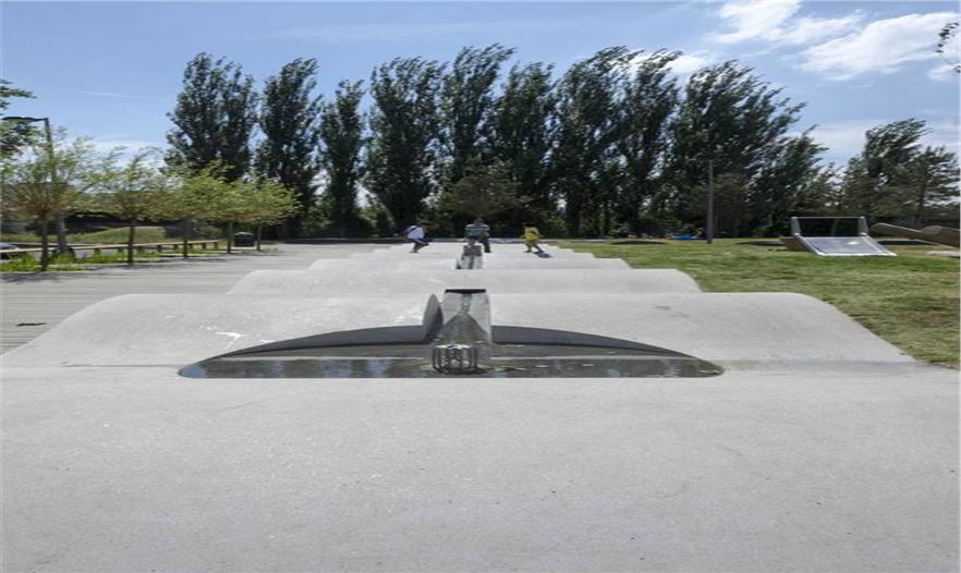 該草坪從道路的兩邊起伏蜿蜒而行,南邊還有帶有水景的白色混凝土條,直接與朝向展館的觀景木臺(tái)相鄰。這是孩子們喜歡跑、滑旱冰的地方,狹窄的水道里還能噴水。