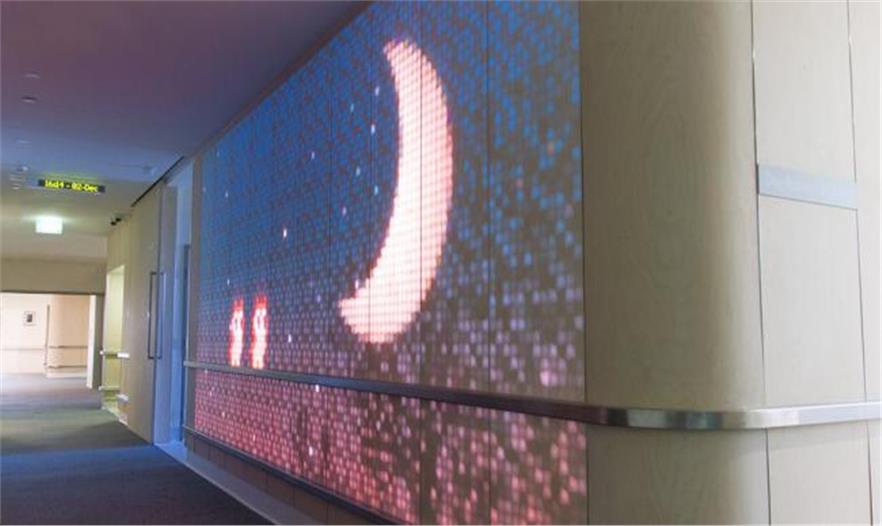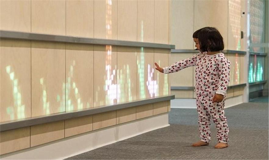 Lumes裝置是由新媒體公司Eness設計的,是發(fā)光的互動性木制材料,為病人營造積極、安靜的環(huán)境。Lumes裝置尤其適合醫(yī)院的兒童病房——誘發(fā)年輕病人焦慮心情的環(huán)境,融入藝術與技術,為經(jīng)過該墻的人提供互動性體驗,其運動會產(chǎn)生動物和景觀動畫娛樂孩子們。