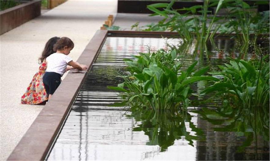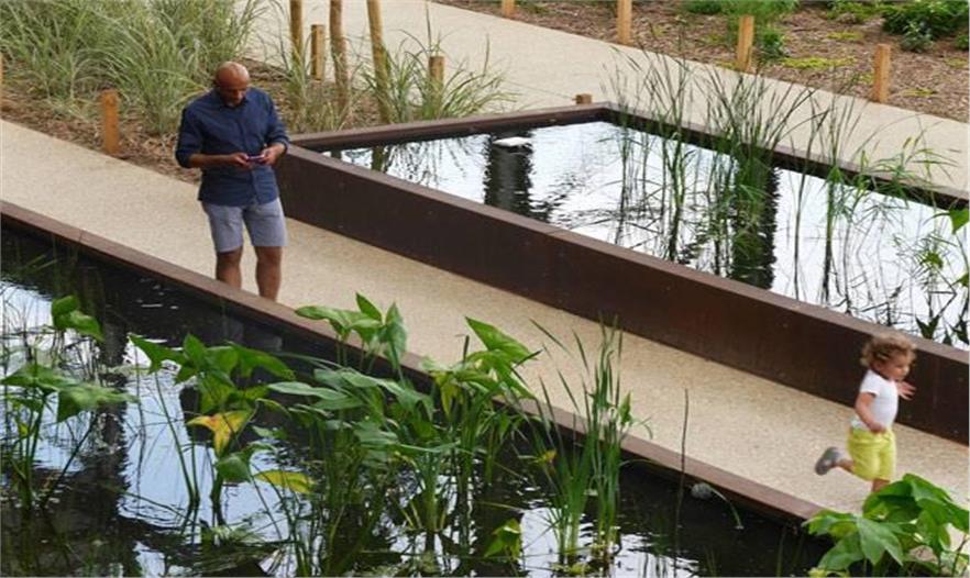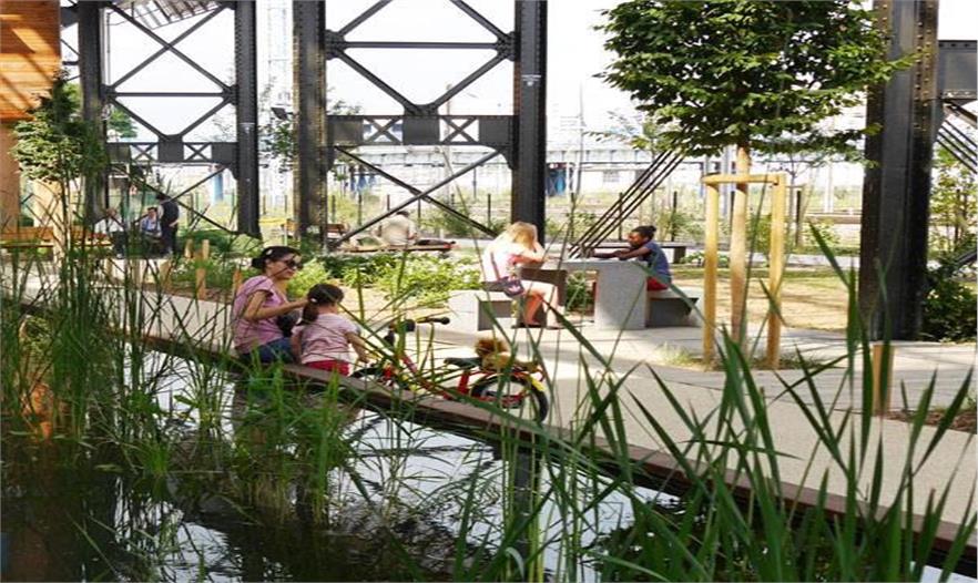 這個看起來就是一項艱巨的任務(wù),因為花園就位于鐵路軌道附近,但是建筑師成功地設(shè)計了休閑場所,整個區(qū)域設(shè)計了緩沖區(qū)。步行道周邊的小型綠色地塊和點綴有水池的游樂場成為人們遠離日常喧囂地方,營造休閑、安靜的氛圍。