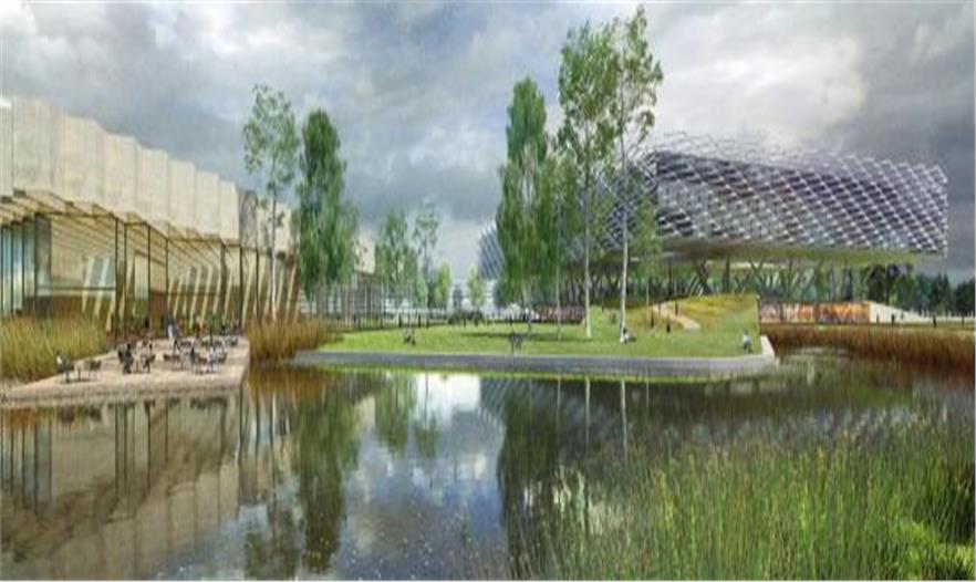 LOLA 設(shè)計(jì)的湖是景觀中的另一個(gè)重要元素。在 HALFTIME 和 ARENA 建筑之間,湖水創(chuàng)造了一個(gè)物理分隔,提供了向東南面的各個(gè)區(qū)域的視線。另外,它也會(huì)在干旱時(shí)期為草地和樹林提供水源,也能夠?yàn)?HALFTIME 樓降溫,發(fā)揮可持續(xù)功能。