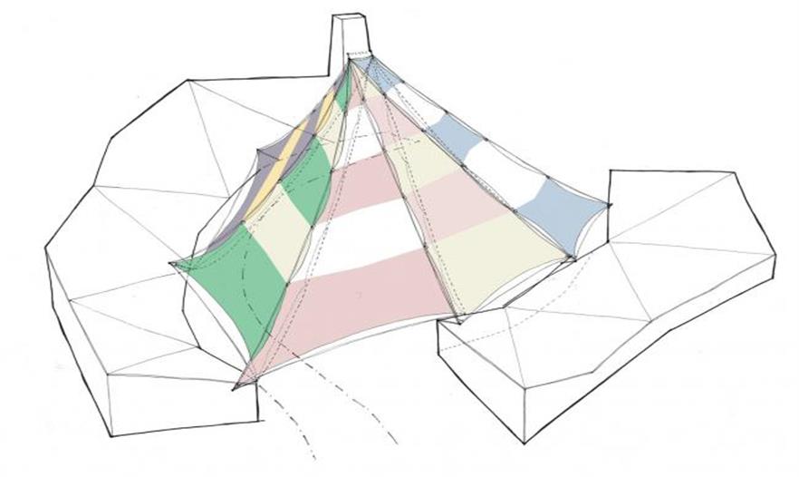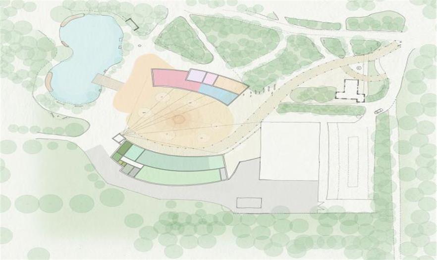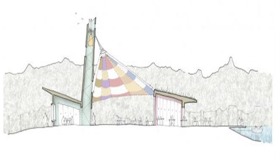 1600平方米的(17200平方英尺)的游客中心的核心為巨大的帳篷結(jié)構(gòu),由彩色的童子軍圍巾縫合而成,象征著來自世界各地的童軍隊(duì)伍。表面將由聚酯涂層,跨越并聚集了從中心的邊界到一個(gè)15米高的木鐘樓之間的空間,這帳篷和塔樓會成為一個(gè)引導(dǎo)游客的穿越公園的新文化遺產(chǎn)旅游路線,同時(shí)為文物中心起到了“煙囪效應(yīng)”的通風(fēng)作用。